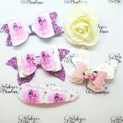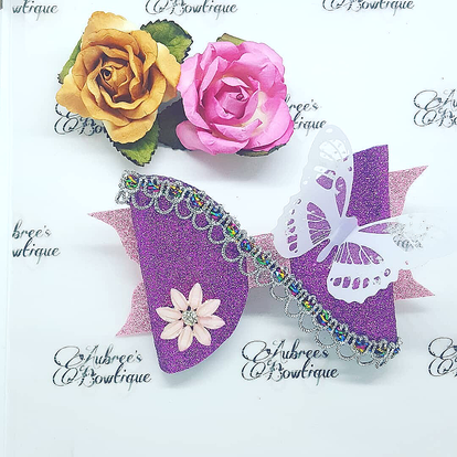 includes- extra large snap clip, two bows on alligator clips and a Butterfly on a alligator clip