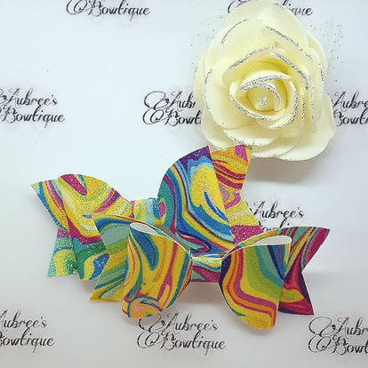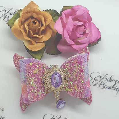 Fantastic coloruful bow canvas backed with glitter on an alligator clip with mulburry rose emblishment